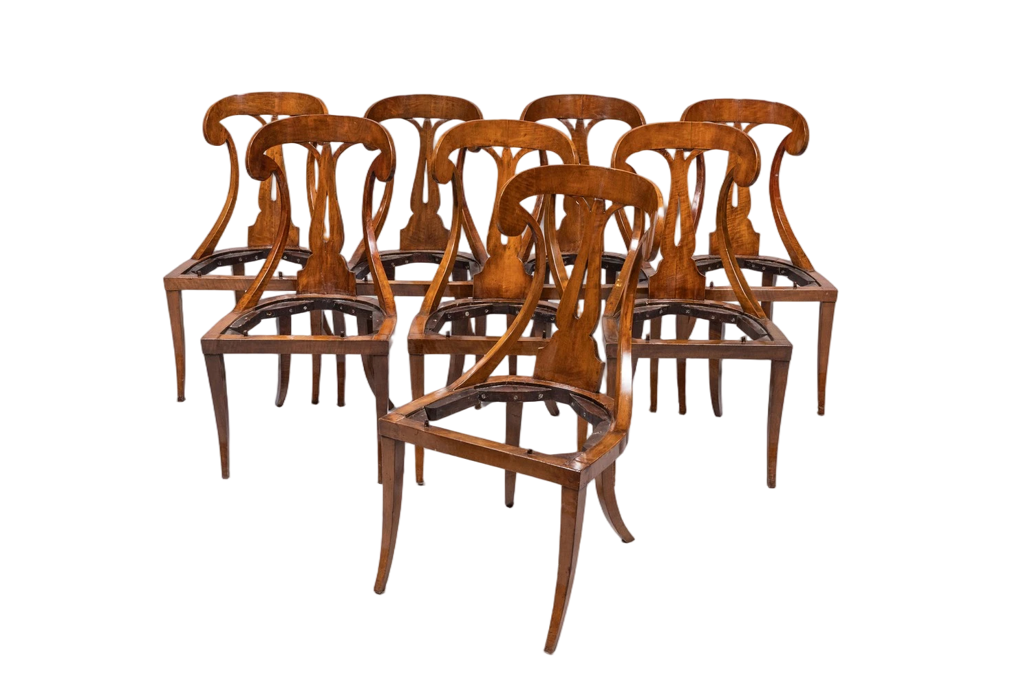 The chairs are accompanied by their original seat insert frames. Note: The photographs showcase the chairs without the insert frames and upholstery.