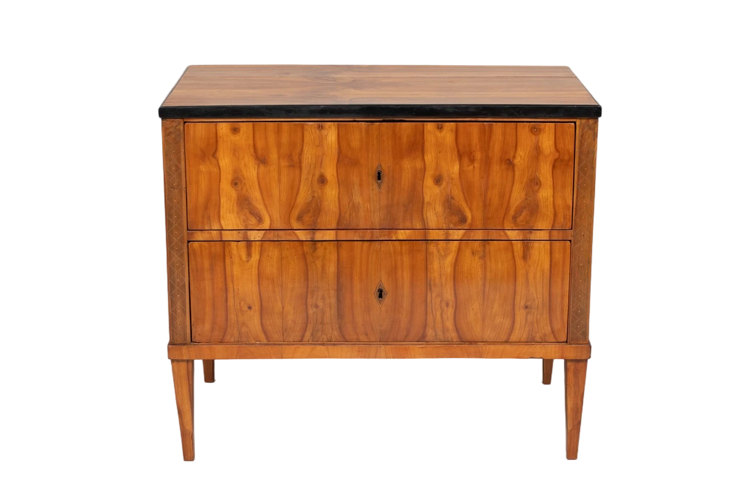A Biedermeier chest of drawers with two drawers, distinguished by its exceptionally beautiful veneer pattern.