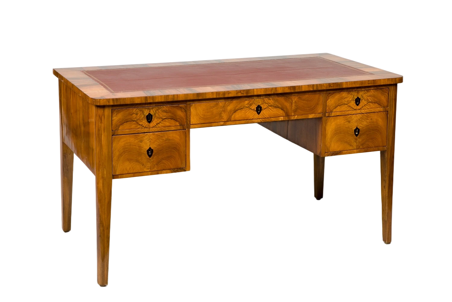 Exquisitely veneered in walnut on a fine softwood body. The writing surface is masterfully finished in leather.