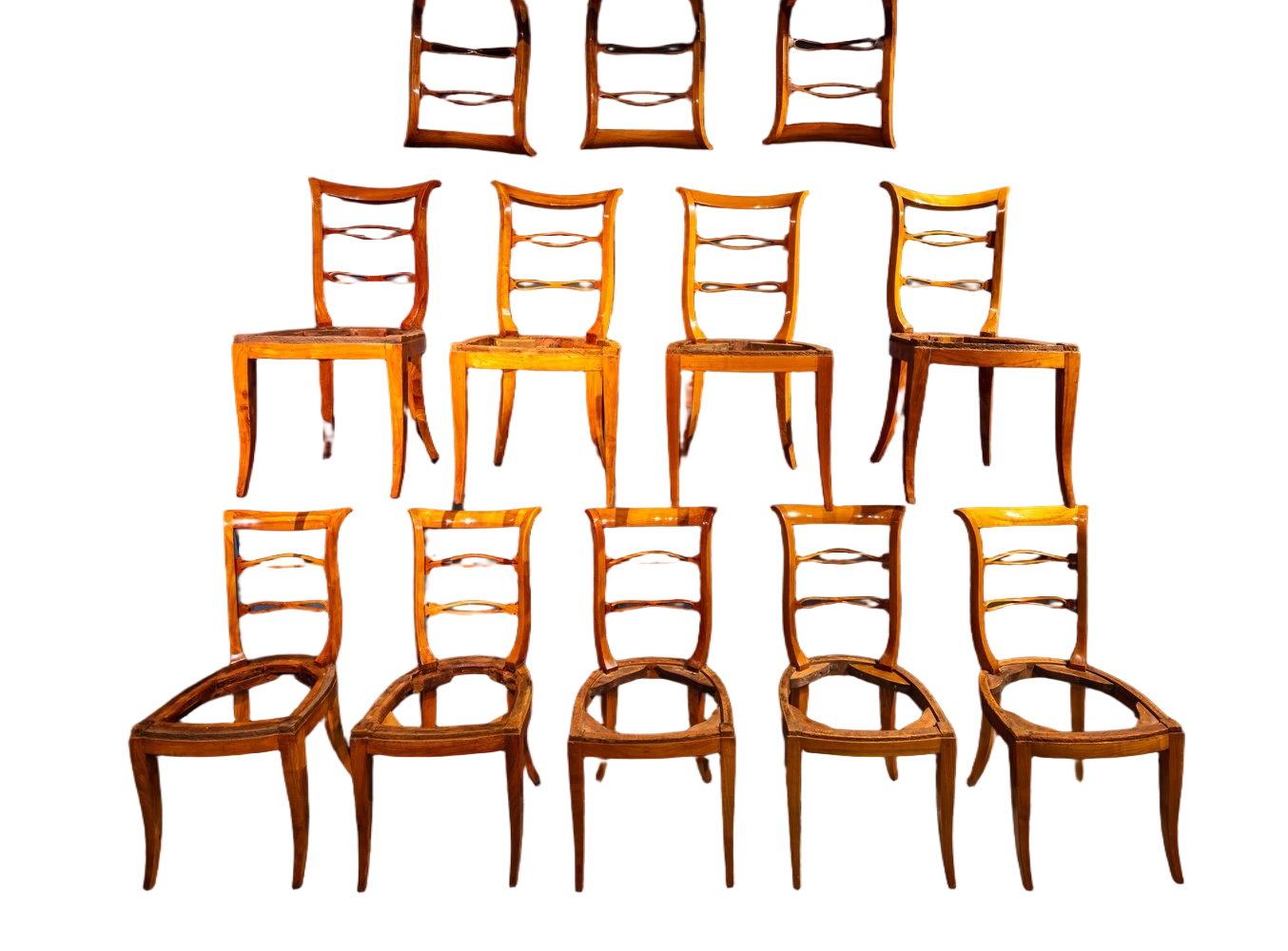 A set of twelve extraordinary Biedermeier chairs, presented in a restored, yet-to-be-upholstered condition.
